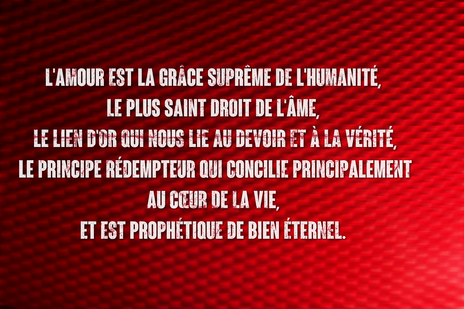 citation d'amour la définition lea 07:37:00 lea citation amour L'amour est la grâce suprême de l'humanité, le plus saint droit de l'âme, le lien d'or qui nous lie au devoir et à la vérité, le principe rédempteur qui concilie principalement au cœur de la vie, et est prophétique de bien éternel. Twitter Facebook Google Tumblr Pinterest Vous aimerez peut-être